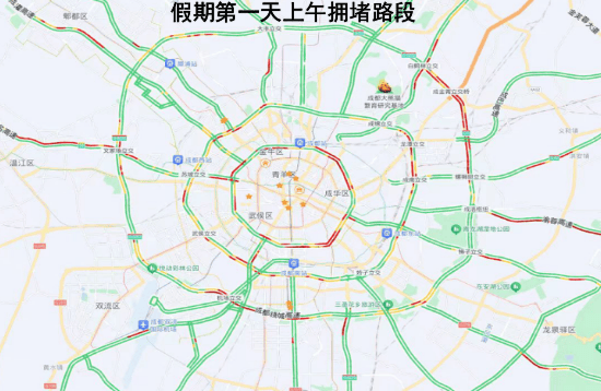10月1日(假期第一天)10:00-12:00城区交通压力较大,我市周边高速、进出城通道、二环高架、三环路、绕城高速等部分路段、转换节点及重要商圈、景区周边交通压力较大,特别是永丰路创业路一线、日月大道、西芯大道,三环路成南立交和绕城高速螺狮坝立交、江家立交、白家立交、犀浦立交、文家立交周边路网交通压力较大;