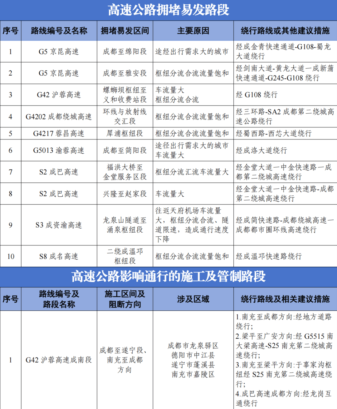 数据显示,假日期间,高速公路拥堵易发路段和影响通行的施工、管制路段主要为: