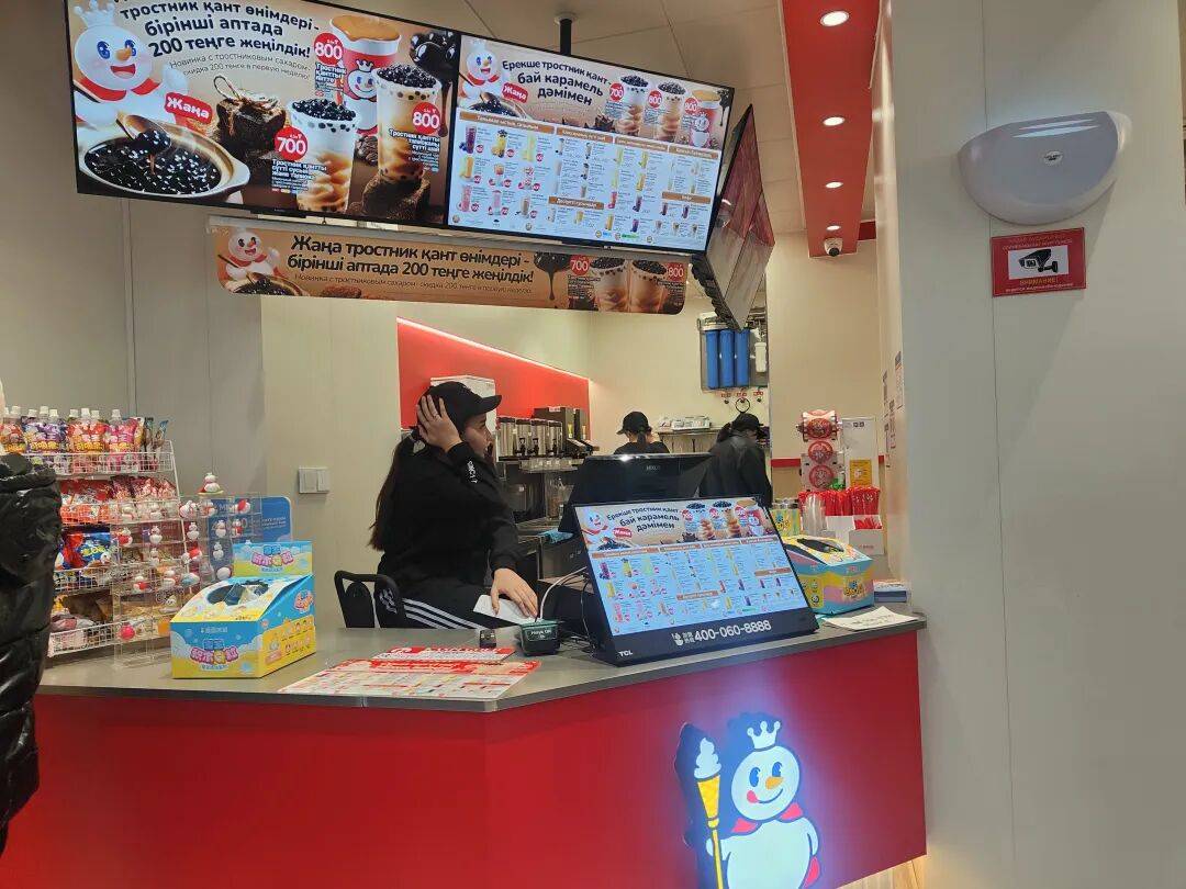 蜜雪冰城的门店依然保持着跟国内相似的视觉设计,门店里茶饮的品类也跟国内相差不大。霞光社看到,这里的饮品在价格上普遍比国内要高。以一款草莓圣代为例,在这里要600坚戈(合人民币8.15元),而国内同款的价格约为6元。