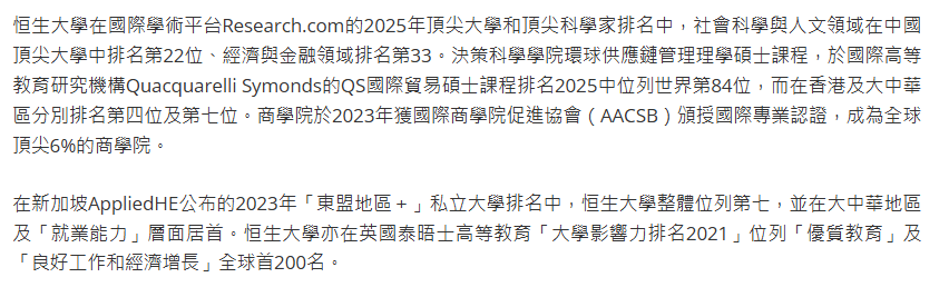 香港恒生大学提供丰富多元的硕士课程,涵盖商学院、传播学院、决策科学学院、人文社会科学学院及翻译及外语学院五大领域。
