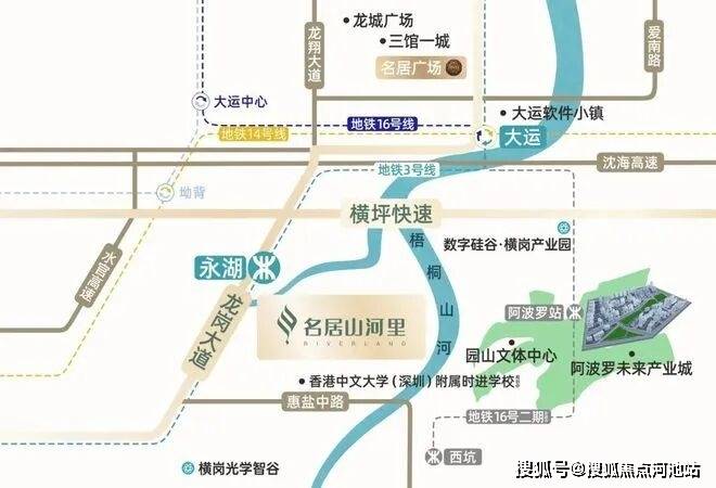 名居山河里,位于龙岗区园山街道3号地铁线米,地处龙岗黄金三角地带,北邻大运新城,东侧是阿波罗未来产业城,西南侧是横岗中心片区。