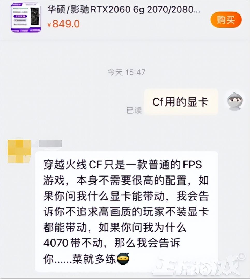 要知道主播广君的显卡是英伟达的4070,十几个CF一起开都不带卡的,官方这波甩锅的操作把让玩家可显卡厂商都整笑了,各显卡商家们纷纷把“菜就多练”当成了引流的流量密码,玩家与商家的对话也越来越抽象。