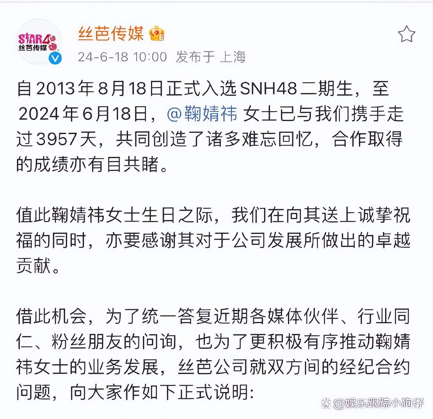 从公司发布的声明来看,鞠婧祎跟丝芭的合约应该是主合约到期了还剩一些部分约。