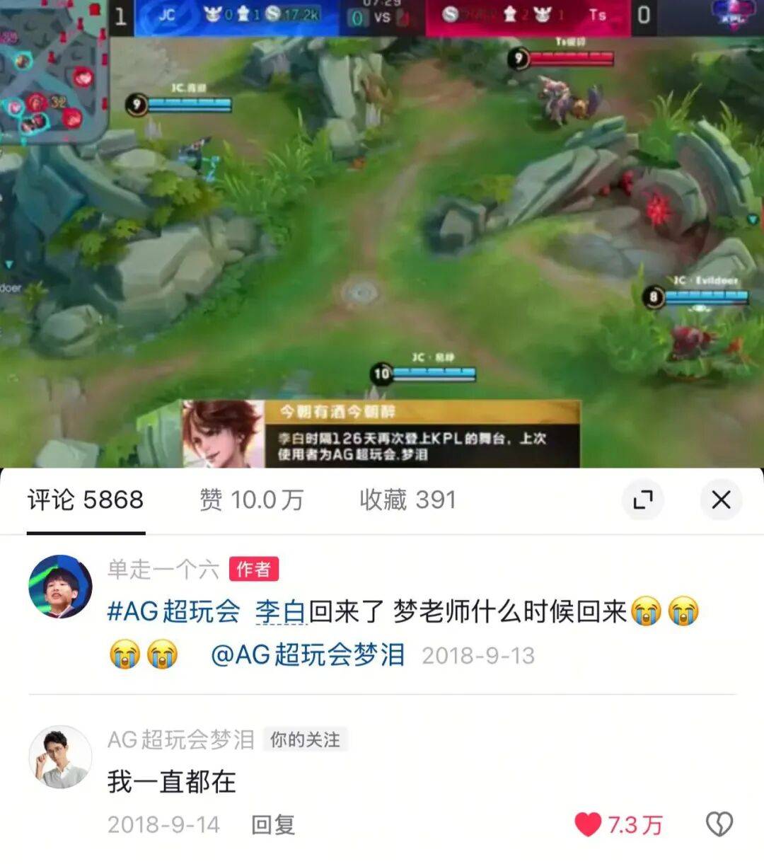 看比赛的时候他顺手截图了李白时隔126天登上KPL舞台的新闻,并写了一句“李白回来了,梦老师什么时候回来”的评论发在了抖音,结果得到了梦泪本人的回复:“我一直都在。”